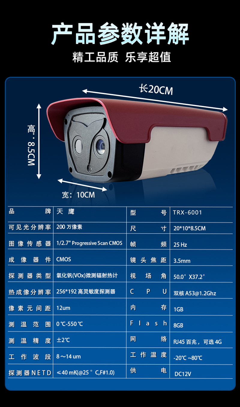 TRX-9001高溫火情煙霧遠(yuǎn)距離監(jiān)測熱成像測溫儀,產(chǎn)品集成了高靈敏度紅外相機(jī)高清可見光相機(jī) ,高性能測溫引擎 ,非醫(yī)療、人工智能 驅(qū)動、 自動報警、可視化平臺、高精度熱成像檢測系統(tǒng) 。二、產(chǎn)品參數(shù):